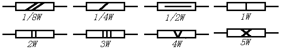当电流通过电阻的时候,电阻由于消耗功率而发热。如果电阻发热的功率大于它能承受的功率,电阻就会烧坏。电阻长时间工作时允许消耗的最大功率叫做额定功率。电阻消耗的功率可以由电功率公式: P=I×U P=I2×R P=U2/R计算出来,P表示电阻消耗的功率,U是电阻两端的电压,I是通过电阻的电流,R是电阻的阻值。 电阻的额定功率也有标称值,常用的有1/8、1/4、1/2、1、2、3、5、10、20瓦等。在电路图中,常用图2所示的符号来表示电阻的标称功率。选用电阻的时候,要留一定的余量,选标称功率比实际消耗的功率大一些的电阻。比如实际负荷1/4瓦,可以选用1/2瓦的电阻,实际负荷3瓦,可以选用5瓦的电阻